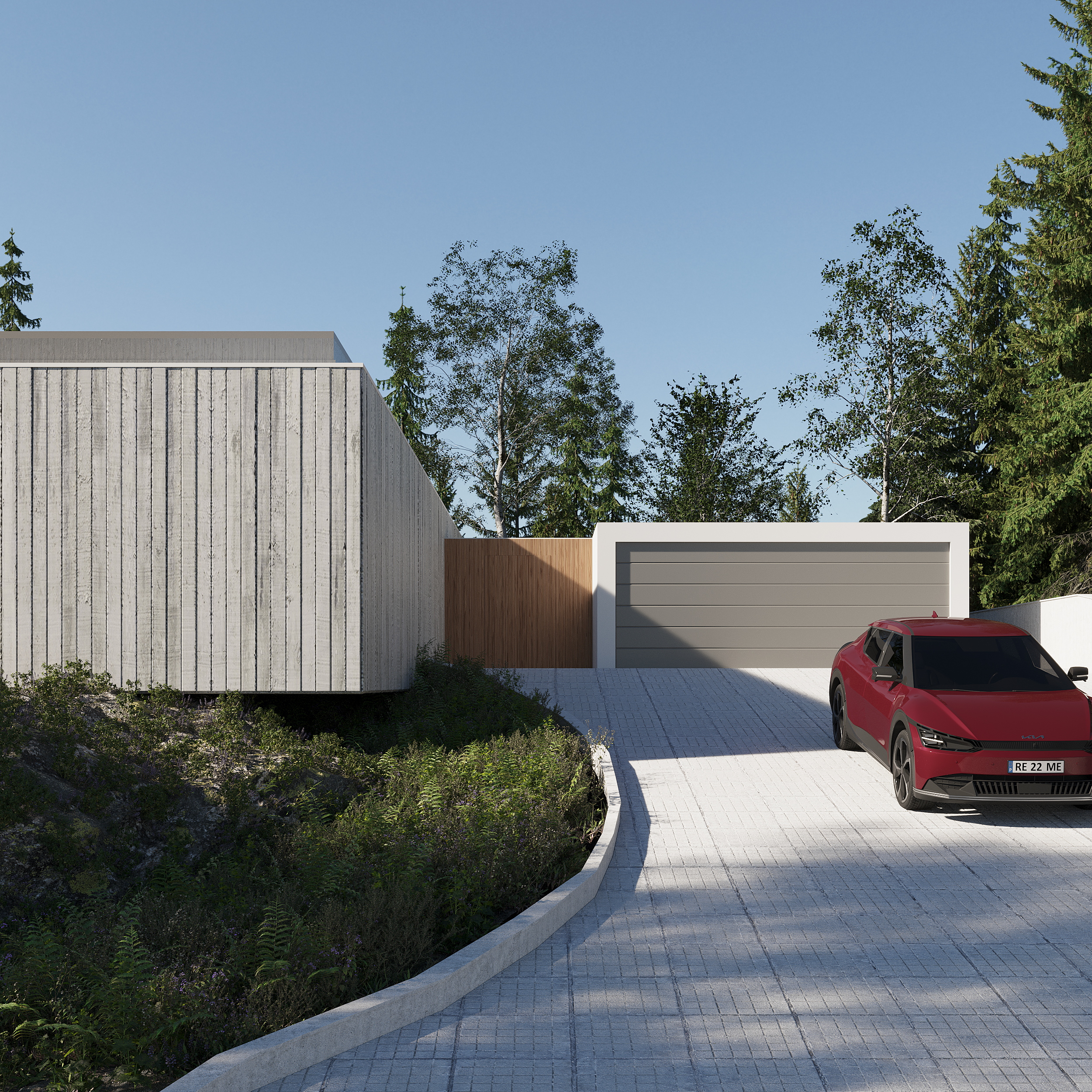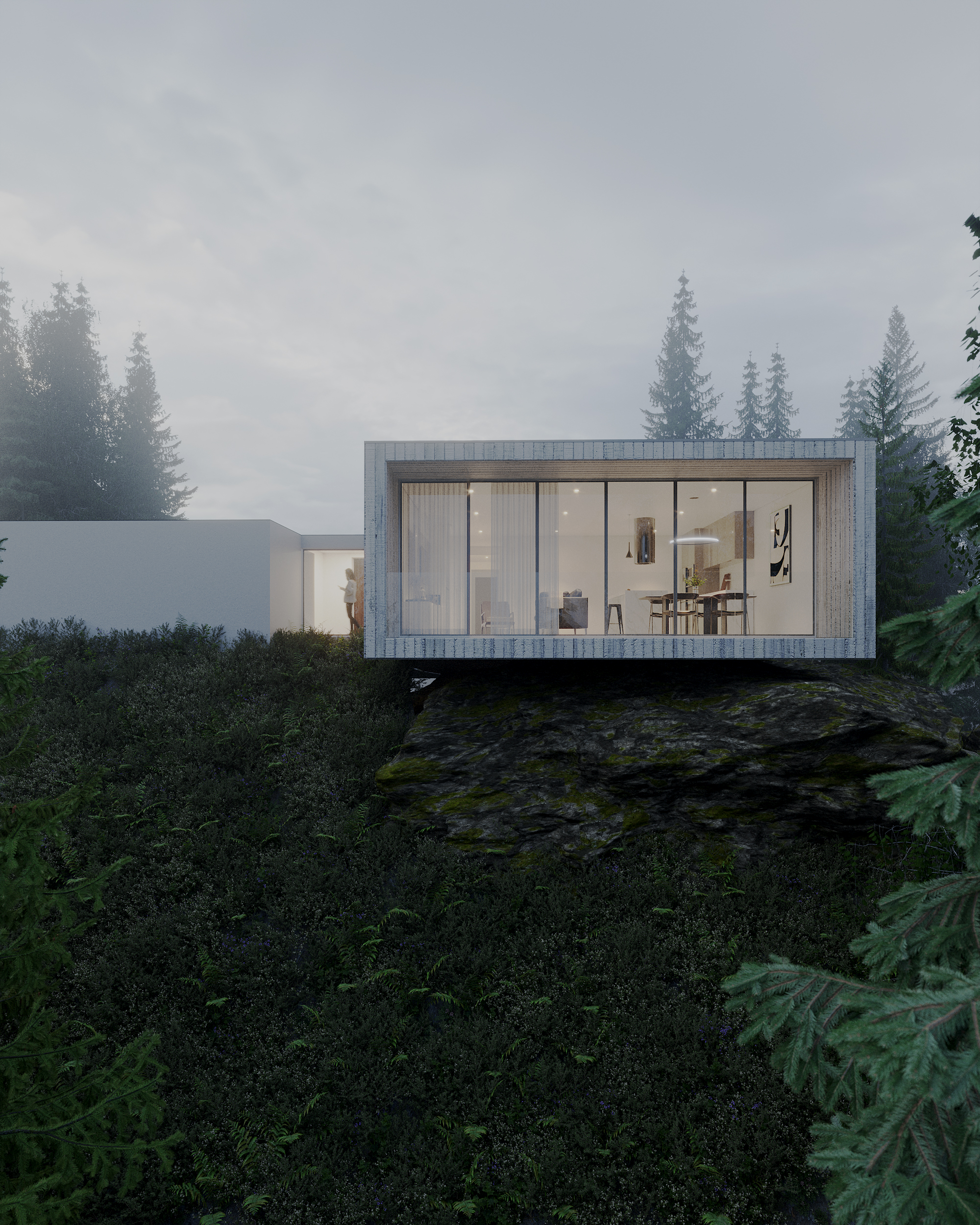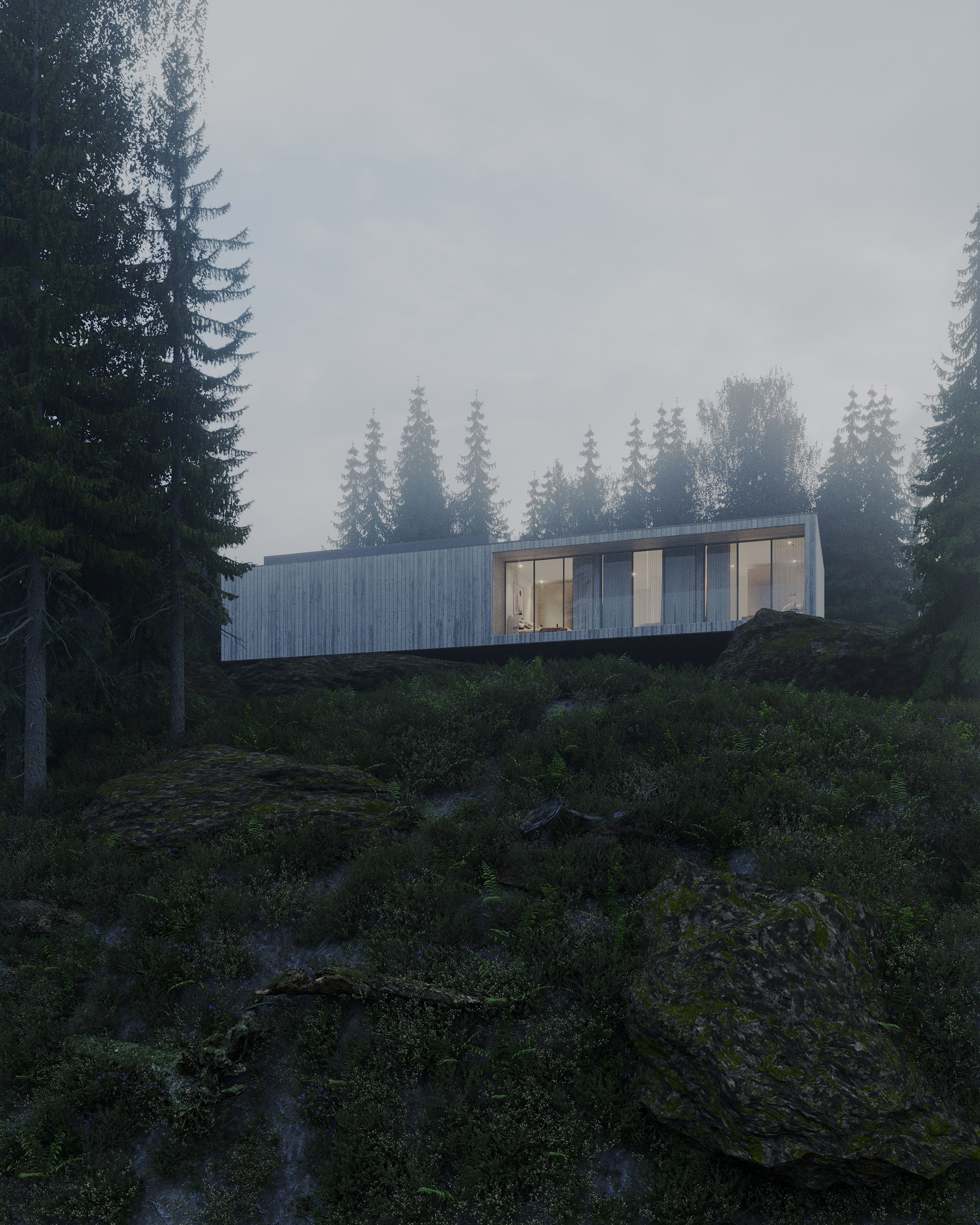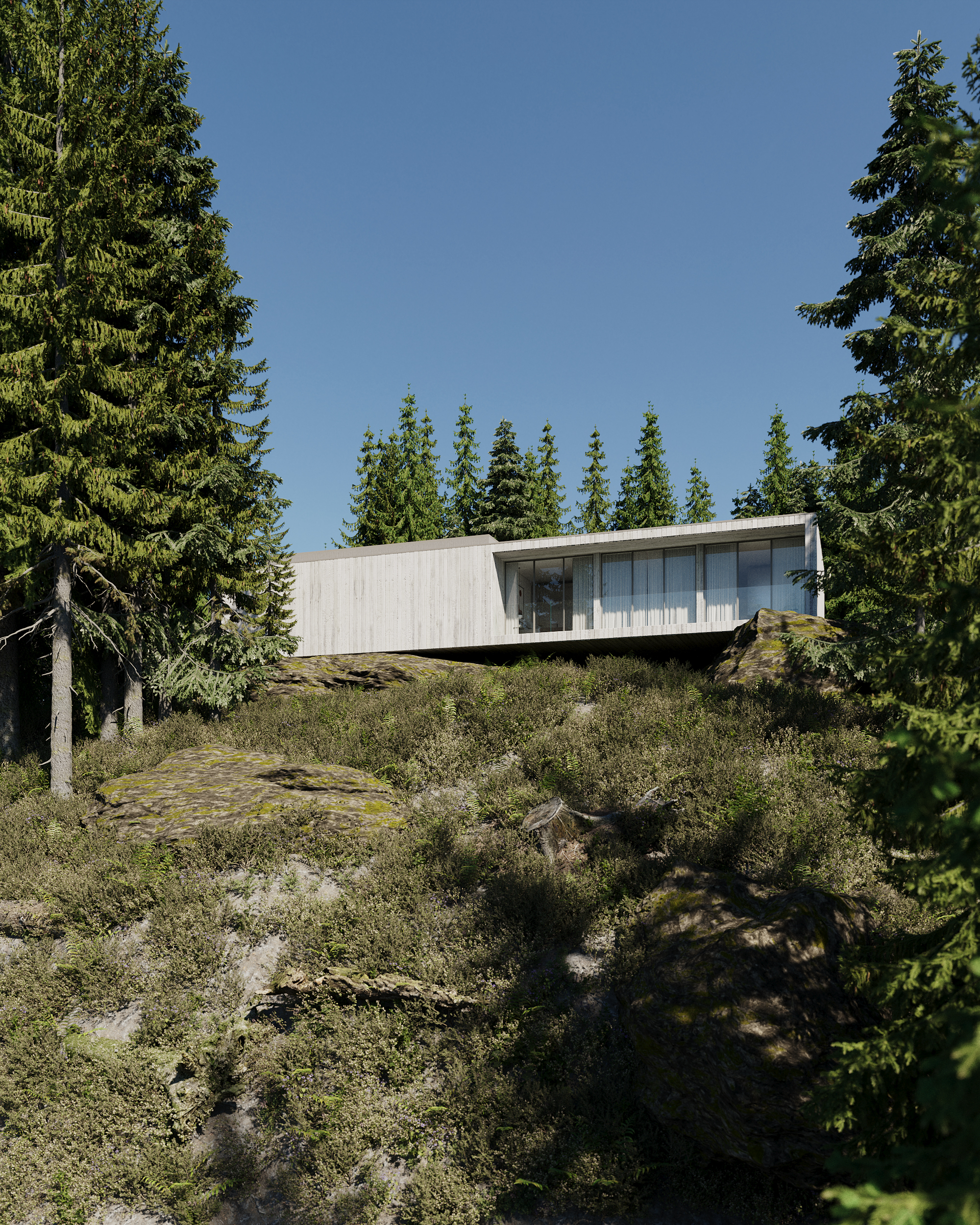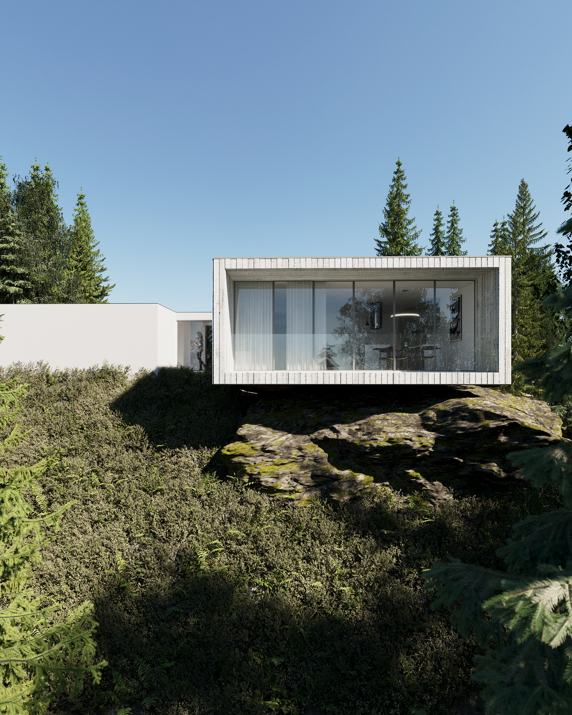 La réalisation des rendus pour le projet Casa do Penedo a été un défi à la fois passionnant et complexe. En représentant une résidence aussi unique et intégrée dans le paysage, notre équipe a dû capturer l’essence de l’architecture contemporaine en harmonie avec la nature environnante. Ce processus a impliqué une reproduction minutieuse du béton apparent et des détails en bois lamellé, en veillant à respecter fidèlement les plans de l’architecte. De plus, l’intégration des deux pierres en tant qu’éléments centraux du décor a nécessité un équilibre délicat entre réalisme et composition artistique. En surmontant ces défis techniques et créatifs, nous avons réussi à créer des images photoréalistes qui reflètent non seulement la beauté et l’unicité du projet, mais aussi la sensation de sérénité et d’admiration que la Casa do Penedo inspire à ses spectateurs.